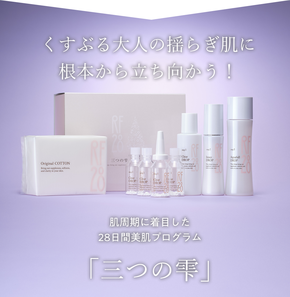 乱れやすい肌周期に着目したスキンケア。洗顔後の肌を、「均す→蒔く→巡らす」の3ステップで整えていきます。肌が生まれ変わる自然のリズムに合わせて、28日分を1箱にセットしています。
